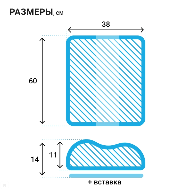 Подушка имеет универсальный размер не требует специального подбора. Высота регулируется за счет вставки из эластичного пенополиуретана. Размер подушки без вставки 38х60х11, со вставкой 38х60х14см